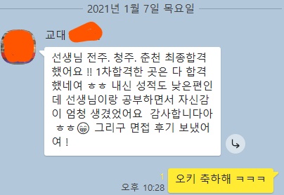 공부하다 보면 자기만의 올바른 가치관이 확립돼서 면접에도 도움이 되지만 나중에 선생님이 되었을 때도 도움이 많이 될 것 같아요. 그리고 긴장 많이 하시는 분들은 모의면접으로 연습 많이 해보시고 떨어도 되니까 하려는 말만 제대로 하자는 생각으로 면접 보세요!